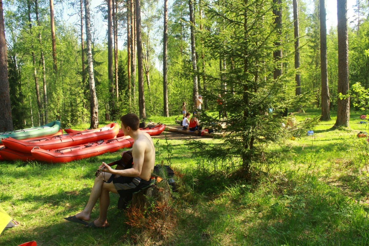 От станции мы отправились пешком до лагеря, около 2 км по просёлочной дороге, всё как в описании. Позавтракав, стали ставить палатки, делать в неспешном режиме текущие дела. Далее обедаем и идём на воду, но прежде прослушиваем курс грамотного инструктажа Екатерины и Алексея, краткая справка о байдарке в целом, и более детально о технике.