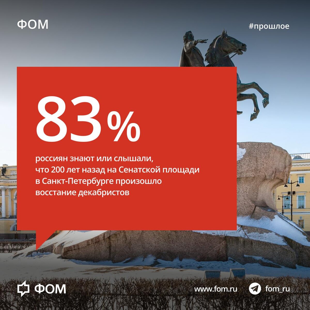 В 1825 году на Сенатской площади в Санкт-Петербурге произошло восстание декабристов. Об этом знают или слышали 83% россиян. 24% считают, что реализация идей и планов декабристов пошла бы на пользу России, 20% полагают, что это могло бы принести вред. Когда люди слышат слово «декабристы», у них возникают ассоциации с различными событиями: «восстание на Сенатской площади», «при царе хотели свергнуть власть», «их отправили в ссылку в Сибирь». Среди положительных аспектов их идей и планов чаще всего упоминаются «перемены в развитии» и «улучшения в России». Среди отрицательных — «любая смута наносит вред России», «возможные огромные экономические потери», «отсутствие готовой программы» и «свержение власти». Подробнее: fom.ru #прошлое #история #декабристы 📱 Фонд Общественное Мнение