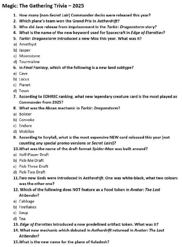 Если решите проверить себя - ответы можно глянуть в первом комментарии по ссылке. =) Я, как настоящий троечник, смог правильно ответить лишь на 7 из первых 15 вопросов =) https://www.reddit.com/r/magicTCG/comments/1pnoovw/2025_magic_trivia_activity_i_made_for_my_playgroup/