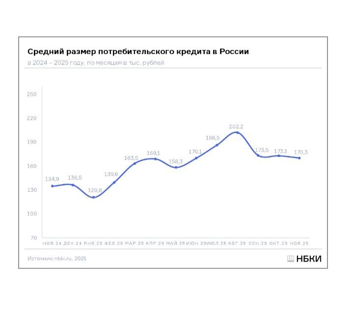 рублей - НБКИ По данным кредиторов, передающих сведения в Национальное бюро кредитных историй (НБКИ), в ноябре 2025 года средний размер выданных потребительских кредитов (кредитов наличными) составил 170,3 тыс. руб., сократившись по сравнению с предыдущим месяцем на 1,6% (в октябре 2025 года – 173,1 тыс. руб.). Показатель снижается третий месяц подряд. При этом по сравнению с аналогичным периодом прошлого года средний чек потребкредита в ноябре 2025 года, напротив, вырос на 26,2% (в ноябре 2024 года - 134,9 тыс. руб.). В конце 2024 – начале 2025гг. данный показатель находился на минимальных значениях по причине ужесточения денежно-кредитной политики регулятора, что имело целью охлаждение кредитного рынка. В частности Банк России ввел ограничения допустимой долговой нагрузки (ПДН).