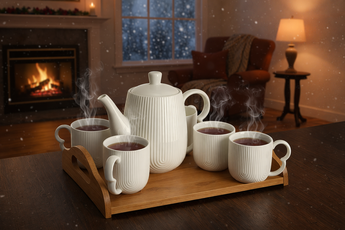 Чайник не «гуляет» по столу, чашки не стоят каждая сама по себе, а вся группа читается как единый объект. В этом наборе фарфор визуально лёгкий — без перегруза деталями, а бамбук добавляет контраст по фактуре. За счёт этого сервиз не теряется даже на большом столе и не требует дополнительного декора вокруг.