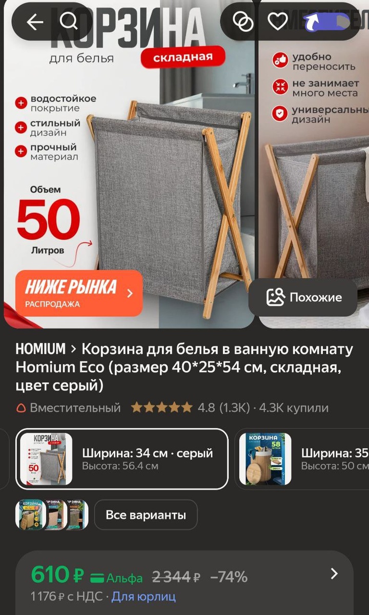 Корзина для белья в ванную комнату Homium Eco (размер 40*25*54 см, складная, цвет серый)