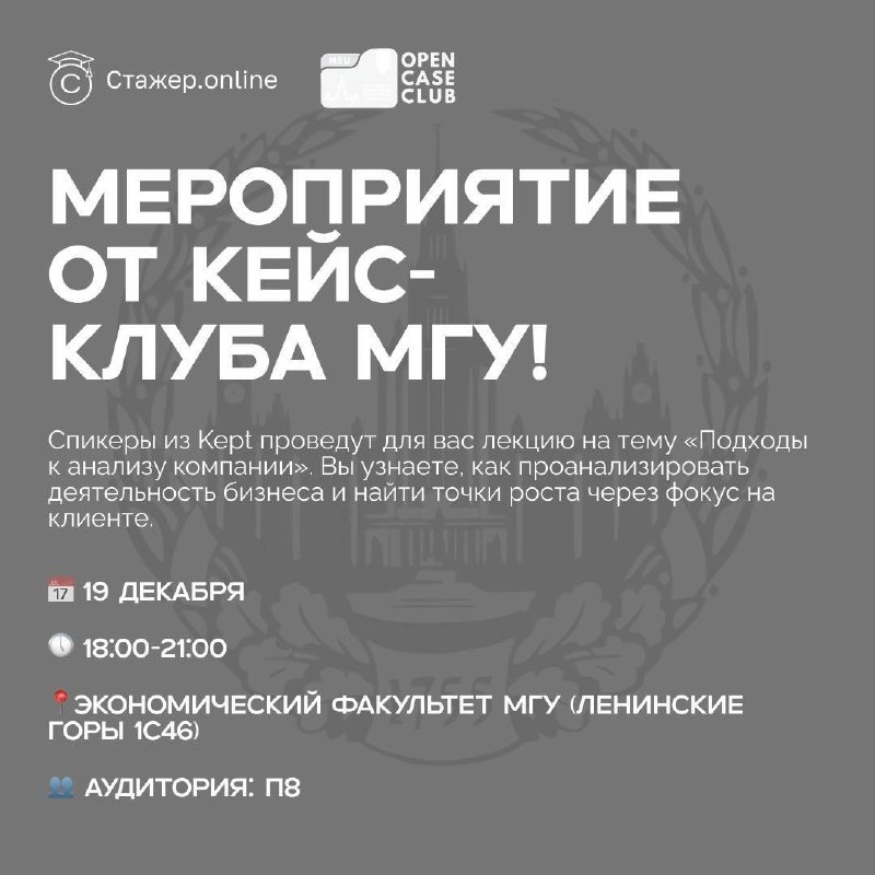 ? 💰 осталось всего 3 дня 😮 Спикеры из Kept проведут очную лекцию в МГУ на тему «Как измерить успех компании: подходы к анализу финансового состояния и ключевых показателей деятельности». *Kept — одна из крупнейших аудиторско-консалтинговых фирм в России с опытом работы более 30 лет! ‼️Лучшая среди аудиторских и консалтинговых компаний по мнению студентов 2024, FutureToday. Сразу после будет практика - командная работа над реальным кейсом. Минимум теории, максимум инсайтов и опыта! Классный бонус: вас будут ждать подарки 🎉 📅19 декабря 🕔18:00-21:00 📍Экономический факультет МГУ (Ленинские горы 1с46) 👥Аудитория: П8 ‼️ Регистрация по ссылке ‼️ clck.ru/3QrGwf #ивенты @StazherOnline