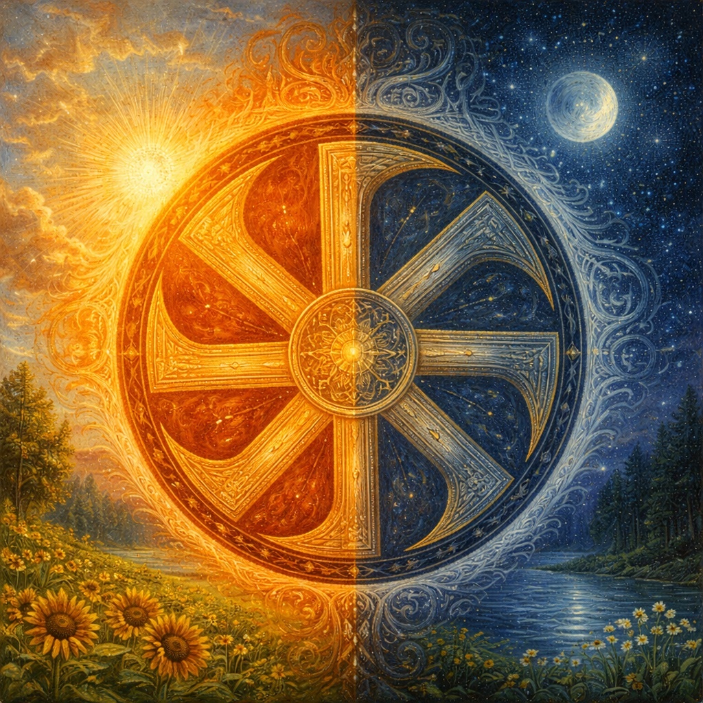 Солнце — это не источник уюта, а мера. Оно показывает, что всему есть срок. И именно здесь появляется Коловрат — не как украшение, а как схема этого движения.