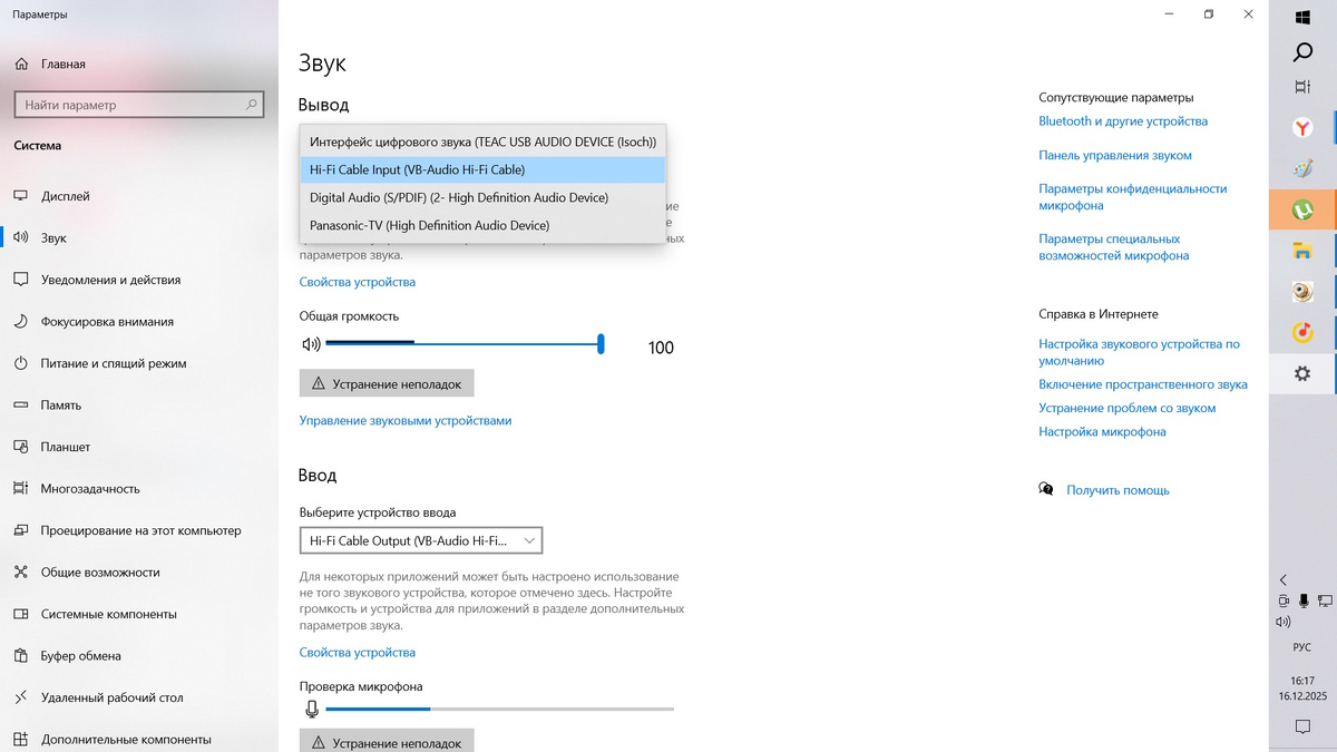 Так случилось, что я проапгрейдил компьютер. И с неожиданностью обнаружил, что звук стрима, через мой ЦАП и hi-fi систему, стал лучше. Если до этого переключение на высокое качество в плеерах стрима давало изменение, ощущаемое скорее на интуитивном уровне, то теперь я явственно слышу (проводил слепой тест) разницу между обычным качеством и "hi-fi" в Сберзвуке. Это вселило надежду и сподвигло к экспериментам. А что если вывести звук, в обход виндовых драйверов? Через ASIO, например. Ведь известно, что ни в браузере, ни в приложении Яндекса нет настроек вывода. А так хочется отправить незамутненный цифровой поток, сразу на ЦАП. Вдруг, есть лазейки? И я ее нашел. Утилита для обхода виндовых драйверов — VB-Audio Hi-Fi Cable. Скачиваем с официального сайта программу. Распаковываем и устанавливаем. Перезагружаем. Главное, чтобы ваш ЦАП поддерживал ASIO и на компьютере, уже были установлены Asio драйверы. Далее открываем "параметры звука" щелкнув правой кнопкой мыши по значку динамика в т