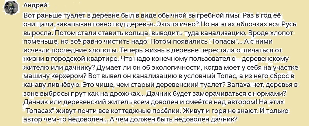 Не хотела сегодня больше публиковать ничего на канале, но пришли беззаботные дачники и начали смеяться над Шефом. Естественно, смолчать я не смогла, и решила продемонстрировать вам, уважаемые читатели высочайший уровень понимания: И действительно, чем должны быть недовольны эти дремучие люди? У них всё хорошо, живут счастливо и богато. В доме полная чаша, машины во дворе, даже керхер есть, можно помыть те машины. Как раз у колодца площадка ровная, мыть удобно. И канава рядом, в неё с топасов все льют. А чего не лить, водичка чистая, прозрачная... Нет у них никаких проблем, даже от Топасов ихних не пахнет, ну просто чудо какое-то и благорастворение в воздусях, как говаривали те неразумные предки, которые бегали до домика с сердцем и ямой под ним в конце огорода. Но мало показалось всем довольным и смешливым дачникам и прочим сельским жителям. Вспомнили они, что государство мало им даёт. И написали они той власти челобитную - дескать хотим чтобы почистили нам колодцы в деревне, а то там