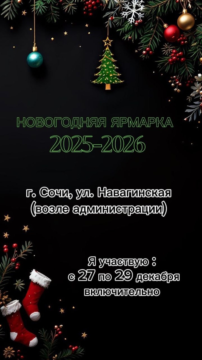 ! С радостью сообщаю вам, что с 24 декабря по 12 января включительно, будет проходить новогодняя ярмарка в г. Сочи, на ул. Навагинская (возле администрации) Около сотни мастеров будут радовать вас своими шедеврами. И конечно, вы сможете приобрести подарки себе и своим близким 🎄