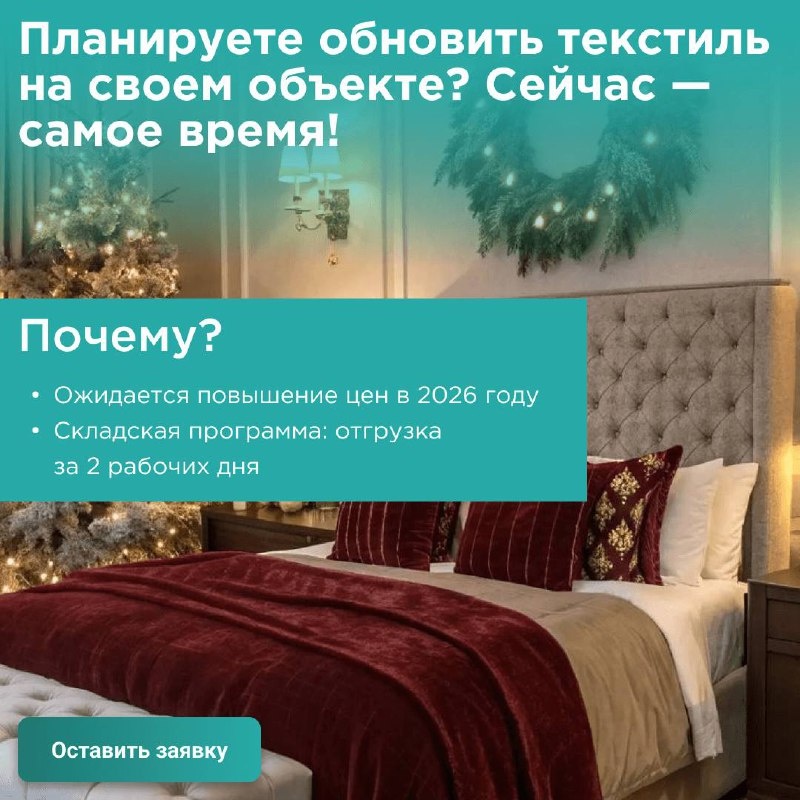 ! 🕐 Если вы задумывались о закупке текстиля, советуем не откладывать решение. ✔️ Почему стоит действовать уже сегодня? ◽️ У Вас еще есть возможность получить заказ до Нового Года ◽️ Выгодная цена: в 2026 году ожидается повышение стоимости текстильной продукции. ◽️ Быстрая отгрузка: благодаря складской программе товар отправится к вам уже через 2 рабочих дня после оформления заказа. ◽️ Продукция в наличии: Вы получаете текстиль без задержек — всё нужное уже на складе и ждёт вашего запроса. ☝🏻 Не упустите возможность обновить текстиль выгодно и оперативно! 👉🏻 Оставить заявку ___ 🤝 Ваш надежный партнер - компания ТД Юнитрейд 🥇 Поставщик года 2025 📦 Товары в наличии и на заказ 🖊 🛒 Для заказа свяжитесь с нами любым удобным способом: 💻Сайт 📲WhatsApp 👉🏻 Max 👉🏻 Telegram ☎️Тел.: 8 800 551 66 09 📩E-mail: info@textilehotel.ru