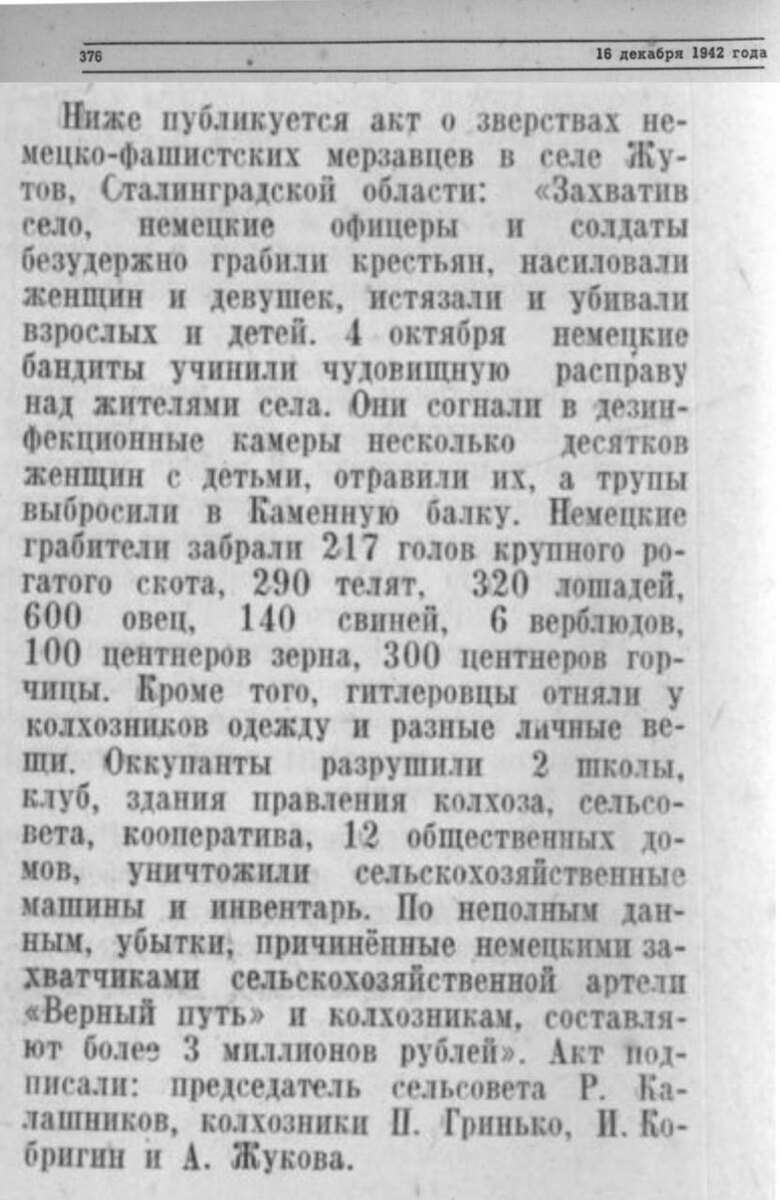 территориях СССР. В 1942 году, в селе Жутов Сталинградской области, мирные жители свидетельствовали, что после оккупации немецкие солдаты и офицеры безудержно грабили крестьян, насиловали женщин и девушек, подвергали пыткам и массово уничтожали взрослых и детей: "Немецкие бандиты учинили чудовищную расправу над жителями села. Они согнали в дезинфекционные камеры несколько десятков женщин с детьми, отравили их, а трупы выбросили в Каменную балку". В 1943 году на хуторе Равнополье и в селе Андреевка Запорожской области гитлеровцы в ходе насильственных облав и угонов населения на каторжные работы в Германию устраивали массовые расстрелы и сжигали мирных жителей заживо: "Заметив приближение разведчиков Красной Армии, немцы вывели советских граждан на окраину хутора и расстреляли их из автоматов. От рук фашистских палачей погибли 54 человека. При отступлении из села Андреевка той же области немецко-фашистские изверги загнали в сарай 13 советских граждан и живьём сожгли их". Подписаться