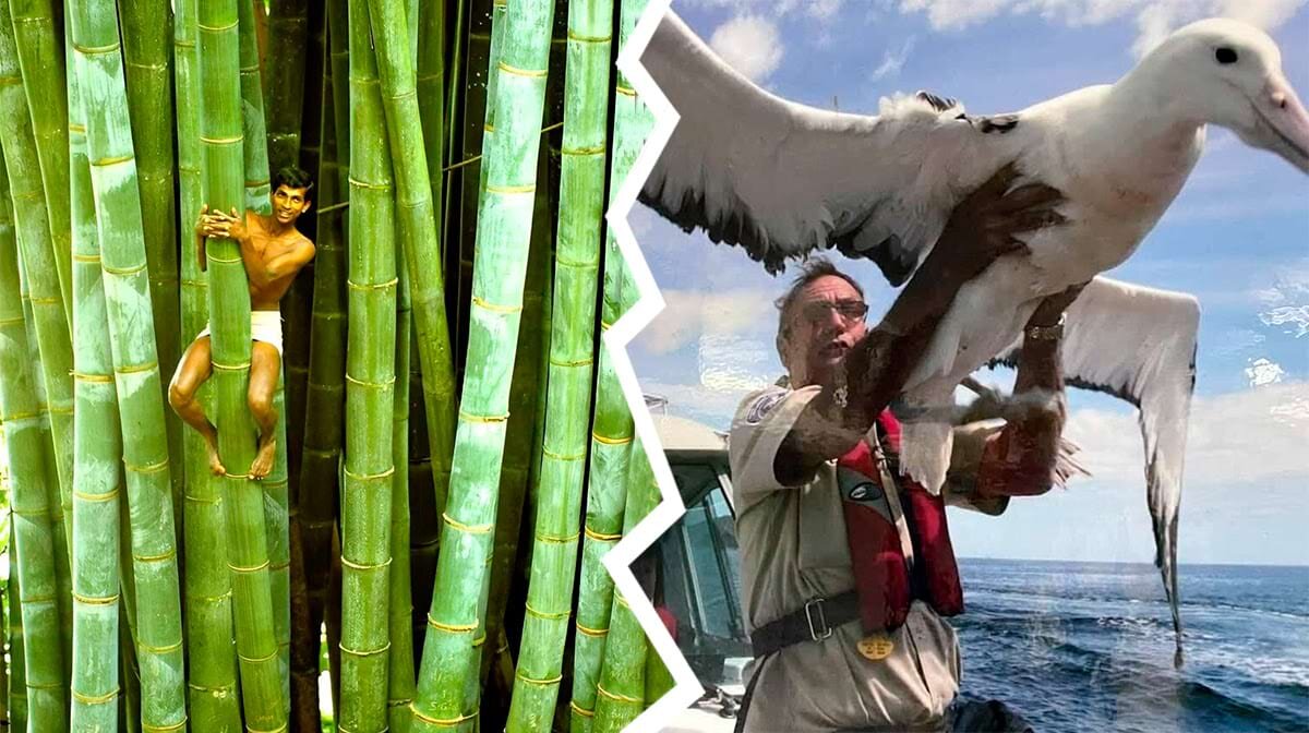 Из-за размеров бамбука, мужчина нём выглядит словно какой-то жук.