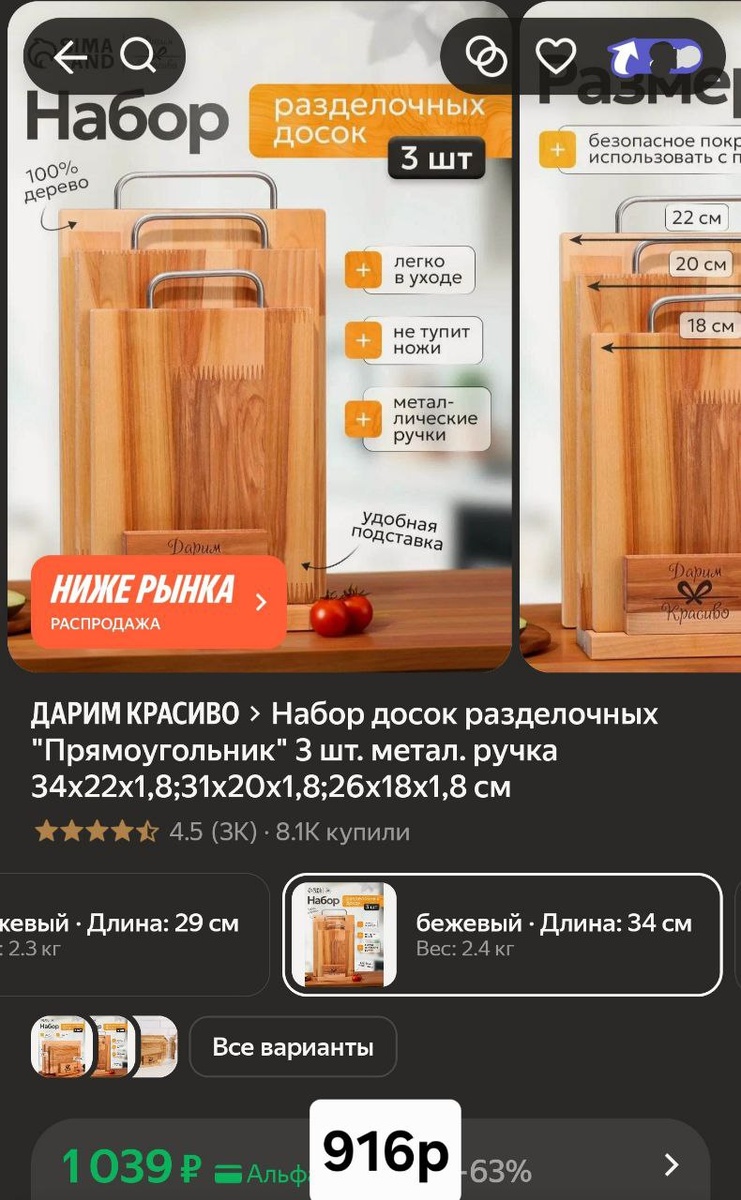 916р (по карте Я.Пэй + промокод) Промокод: BYSIMA10 - найдите его ниже в карточке товара, активируйте подписавшись на магазин и примените в корзине. ➡️Получить карту Пэй ➡️Подписаться на канал ℹ️ Подставка, металлические ручки, размер досок: 34х22х1,8; 31х20х1,8; 26х18х1,8 см ℹ️В карточке еще наборы досок, сбиваем цену этим же промокодом.