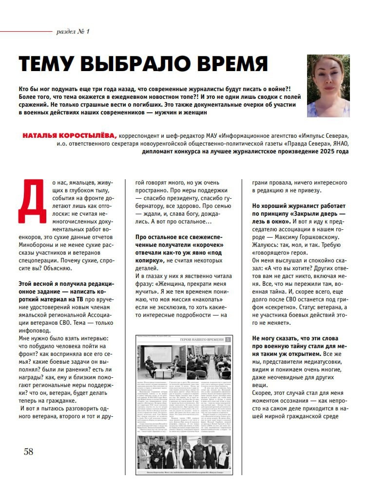 Работу нашей талантливой коллеги Натальи Коростылёвой под названием «Тему выбрало время» опубликовали в издании «Журналистика и медиарынок»! Документальные очерки — не просто страницы текста, а настоящая хроника мужества и стойкости. Наталья погрузилась в судьбы участников боевых действий на СВО, чтобы рассказать их истории, которые требуют нашего внимания и понимания. Гордимся Натальей и желаем ей неиссякаемого творческого вдохновения!