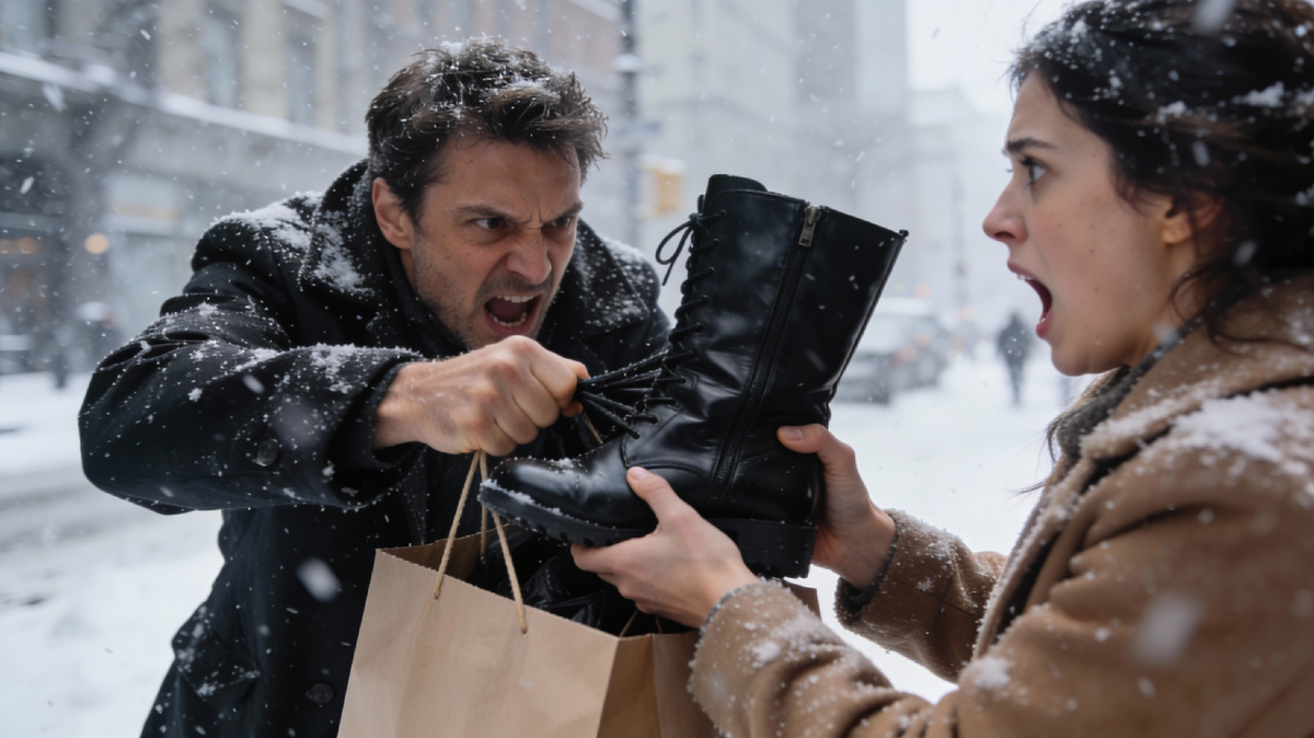 Муж стоял с моим пакетом в руках, тяжело дыша, как будто только что пробежал марафон. Его лицо было красным, на лбу выступили капли пота, несмотря на мороз.