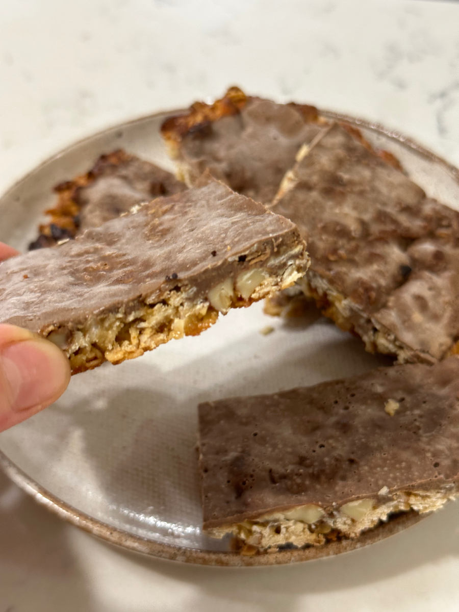 Это просто пушка, огонь, пожар🤤🤤🤤 Настолько вкусно, что я была готова съесть одна все печенье Просто ум отъешь😍 ▫️Овсяные хлопья долгой варки 2 стакана ▫️Миндаль или любые другие орехи 1/2 стакана ▫️Кокосовое масло 3 ст л ▫️Сироп топинамбура 3 ст л ▫️Тахини 2 ст л Для шоколада: ▫️Кокосовое молоко 1/2 стакана ▫️Какао или кэроб 1 ст л с горкой Смешиваем все ингредиенты для печенья , выкладываем на пергамент ровным слоем и запекаем на 180 градусах около 10 минут (обязательно следим, как станет золотистым, нужно вынимать) В это время готовим шоколад: в хорошо разогретое кокосовое молоко добавляем какао и качественно перемешиваем, чтобы не было комочков Даем остыть коржу и шоколаду На остывший корж выливаем шоколад и распределяем ровным слоем. Отправляем в морозилку на 1.5-2 часа После того, как замерзло, разрезаем на порционные куски и наслаждаемся