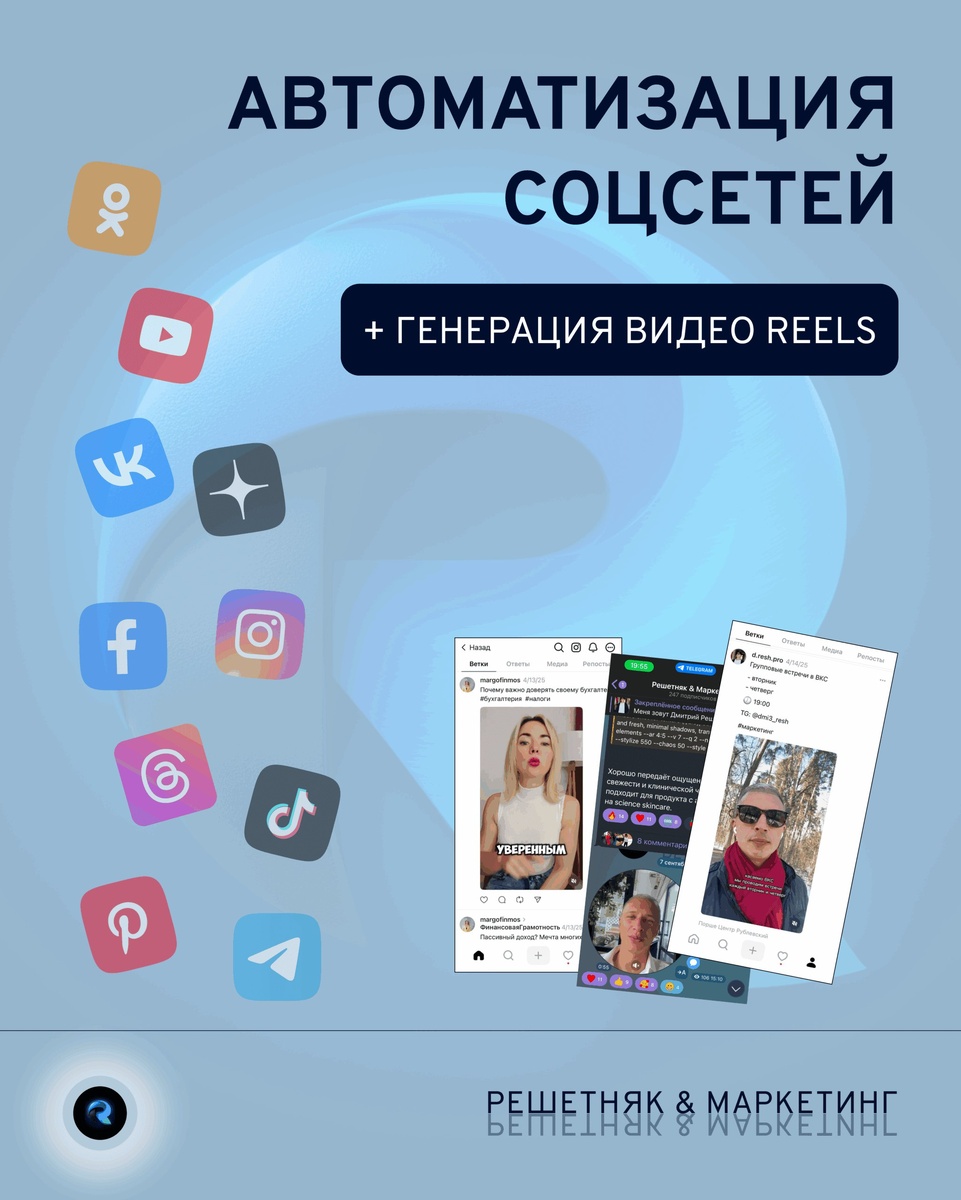 ! Ты предприниматель, а не раб контент-плана. У тебя есть продукт, клиенты и жизнь. А не 200 рук, чтобы снимать, писать, выкладывать, адаптировать и постить в соцсетях. 📌 Мы создали систему автоматизации соцсетей под ключ. Что это значит? ✔️ Ты просто ведёшь Telegram-канал ✔️ Мы создаём 500+ адаптированных публикаций в месяц ✔️ Генерим Reels, статьи, посты и даже новости — на автомате ✔️ Адаптируем контент под алгоритмы каждой платформы ✔️ Публикуем в: фотосеть, VK, соцсеть, Dzen, Telegram, YouTube, Pinterest, ВКонтакте и др. 🔁 Один твой пост увеличивает медиаприсутствие компании на всех площадках. 🎯 Результат? — Тебя видно везде — Контент выходит сам — Люди приходят — Бизнес растёт — А ты занимаешься своим делом 📩 Пиши в личку или ставь ➕ в комментариях. Забудь про хаос. Работай по системе. И пусть интернет работает на тебя, а не через тебя. ☎️ Решетняк& Маркетинг 🌐 v-smm.ru