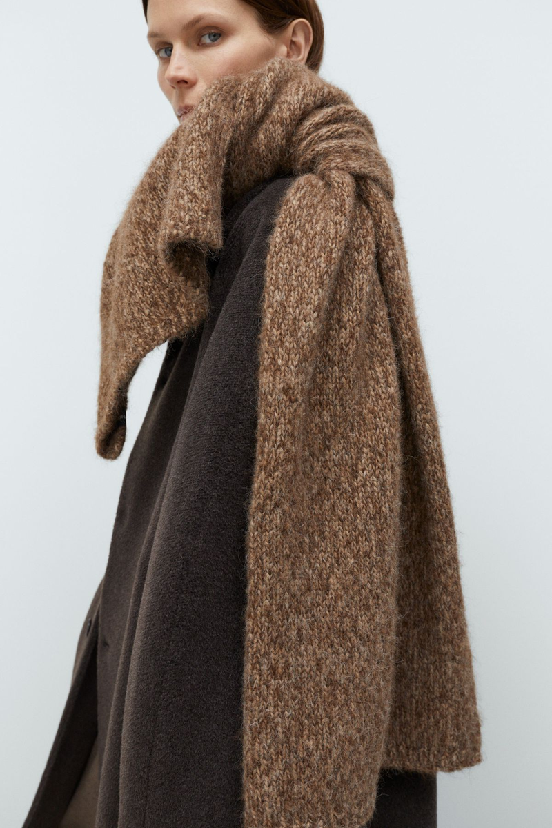 - Если хотите, чтобы шарф заменял и шапку, и капюшон, комфортная длина начинается примерно от 220–240 см. Такой шарф можно пару раз обернуть вокруг шеи и ещё накинуть на голову.
