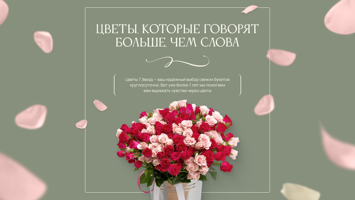 Из-за сумасшедшего ритма жизни мы часто ищем не просто красивый букет, а надежный способ выразить свои чувства, не тратя при этом время и лишние средства на долгий выбор. Срочность, сомнения в цене и свежести могут испортить впечатление от подарка. «Цветы 7 Звезд» — это ваш круглосуточный цветочный магазин в Москве. Мы существуем, чтобы цветы говорили больше, чем слова, а вы чувствовали спокойствие и уверенность в каждой покупке. Здесь сочетаются традиции флористики, честная цена и безупречное качество. Мы предлагаем вам не просто купить цветы, а получить надежную гарантию того, что ваш подарок будет уместным, красивым и свежим. Широкий ассортимент: букеты, сборные композиции, горшечные растения, шарики и декор.