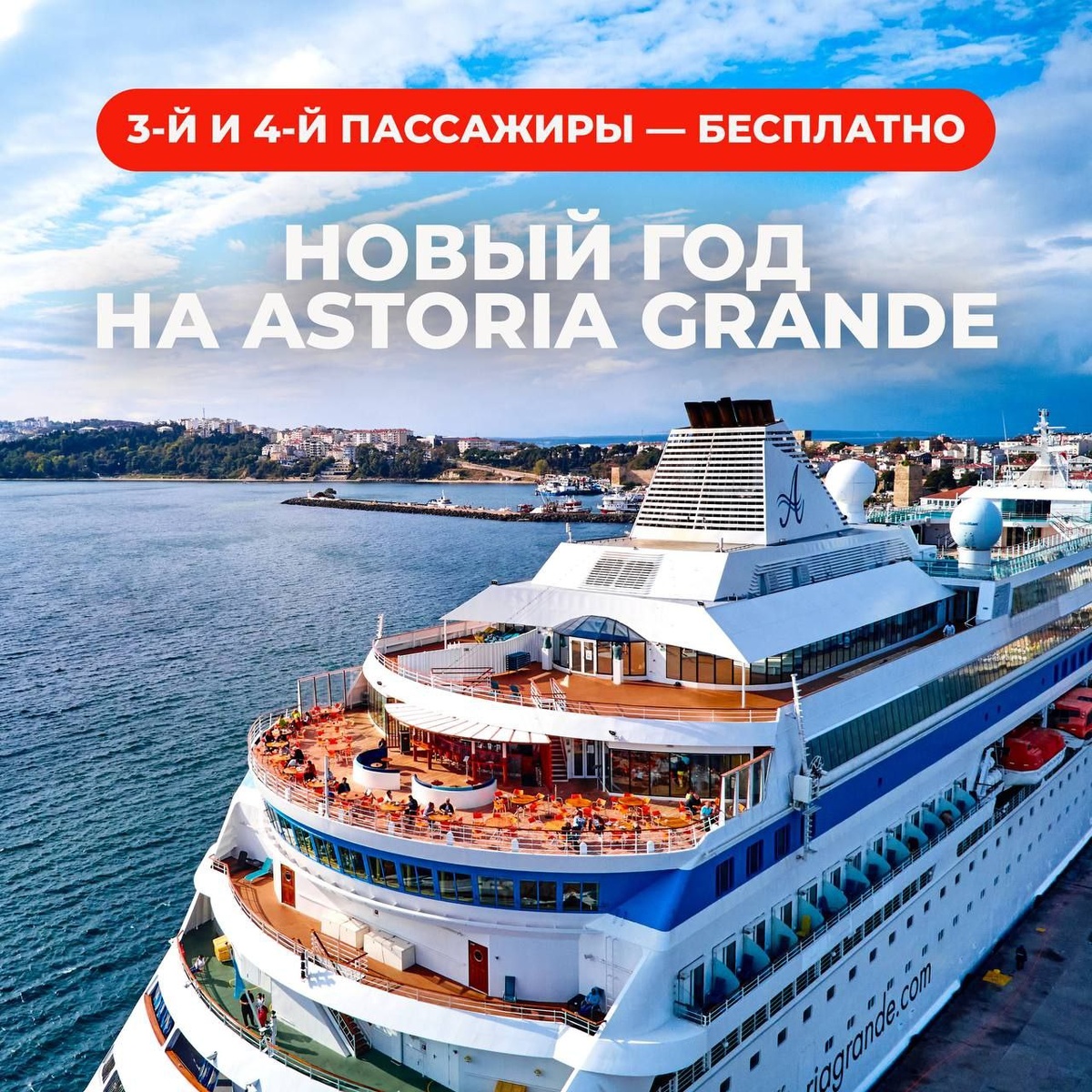 ! Классная акция в круизе с 30.12 по 06.01 на Astoria Grande: при четырёхместном размещении 3-й и 4-й пассажиры в каюте путешествуют БЕСПЛАТНО! Предложение распространяется только на категории OX и OE. 🔸В программе новогоднего круиза: праздничный гала-ужин, бой курантов, насыщенные развлечения и особая дружеская атмосфера. 🔸Гости праздничного рейса: Алексей Потехин, сооснователь и автор хитов группы «Руки Вверх!», команда КВН «Уездный город» и харизматичный DJ Antonio. Также напоминаем, что в этом рейсе дополнительно предоставляется 50€/чел. для первых двух пассажиров во всех категориях кают. 🤩 Новогодний круиз.