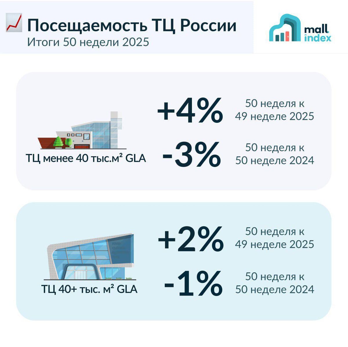 * *Итоги 50 недели 2025* *ТЦ менее 40 тыс.м² GLA*: *+4%* к 49 неделе 2025 *-3%* к 50 неделе 2024 *ТЦ 40+ тыс.м² GLA*: *+2%* к 49 неделе 2025 *-1%* к 50 неделе 2024 > «Предновогодний период традиционно остается одним из наиболее высоких сезонов с точки зрения прироста аудитории ТЦ» – Михаил Васильев