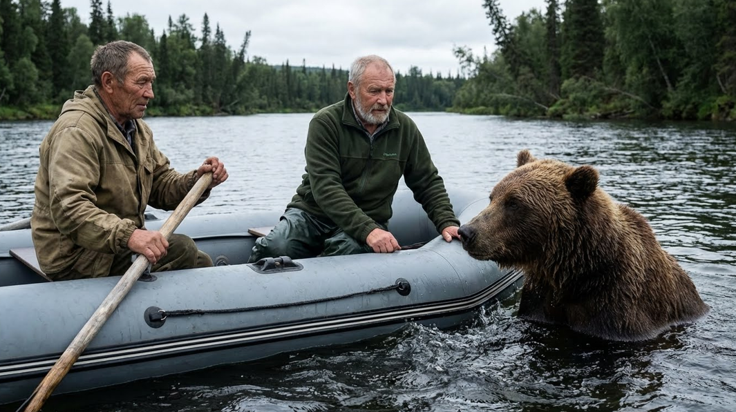 Мотор захлебнулся и замолчал. Лодку сразу подхватило течение и понесло — спокойно, но уже не по их воле. В этот момент Егор заметил в воде движение. Что-то большое шло поперёк реки, тяжело разрезая поверхность. Это был медведь. Мокрый, массивный, он плыл уверенно и без суеты, будто делал своё дело и не обращал внимания ни на лодку, ни на людей.
