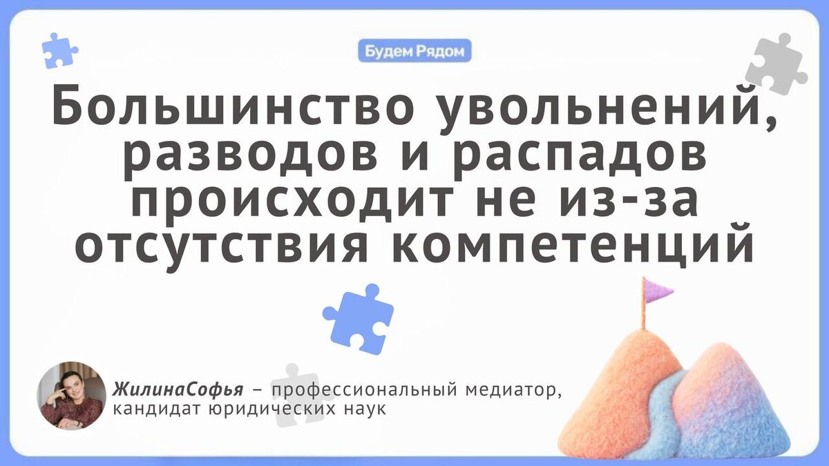 А из-за неумения работать с конфликтами. ➡️ Компетенции можно нарастить всегда. Этому учат, под это находят время и ресурсы. А вот с конфликтом иначе: либо вы умеете с ним обходиться, либо годами ходите вокруг одной и той же точки, не понимая, почему ситуация не меняется. В этом и есть парадокс конфликта. Он не про то, кто прав или виноват. Он про сигнал. Система перестала работать так, как раньше, и жизнь аккуратно, а иногда очень жестко, предлагает ее пересобрать. Если этот сигнал игнорировать, начинаются потери. 🔵На работе Сильных специалистов редко увольняют «за некомпетентность». Чаще их просто перестают слышать. Обязанности размываются, ожидания остаются невысказанными, а обратная связь постепенно превращается в давление. Конфликт может тлеть месяцами, накапливаться, и в какой-то момент он выходит через выгорание. Человек уходит. Формально – «не справился». По сути, не смог управлять конфликтом, который давно просился быть решенным. 🔵В паре Разводы редко происходят потому,