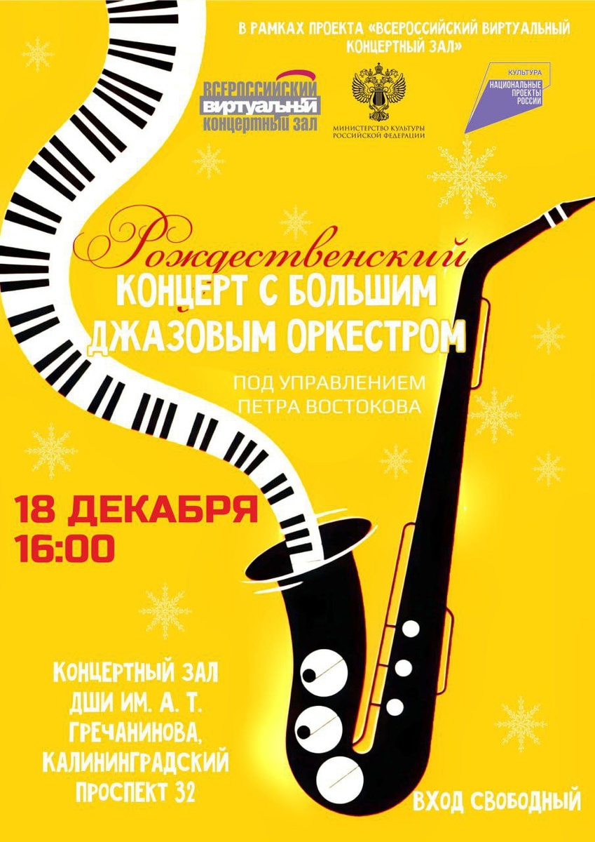 Почувствовали эту атмосферу? В этот четверг в концертном зале нашей Детской школы искусств слушайте и наслаждайтесь «Рождественским вечером с Большим джазовым оркестром»! Детская школа искусств имени Гречанинова продолжает серию открытых просмотров в Виртуальном концертном зале. 18 декабря (четверг) в 16:00 приглашаем на показ трансляции концерта традиционной зимней программы «Рождественский вечер с Большим джазовым оркестром под управлением Петра Востокова». Это будет вечер истинной рождественской музыки в джазовых интерпретациях. В программе: отрывки из сюиты Чайковского «Щелкунчик», рождественские гимны и популярные новогодние мелодии, зимние музыкальные зарисовки и, конечно же, море джаза. 📍 Виртуальный концертный зал находится в концертном зале ДШИ имени Гречанинова по Калининградскому проспекту, 34. Вход свободный! #Светлогорск