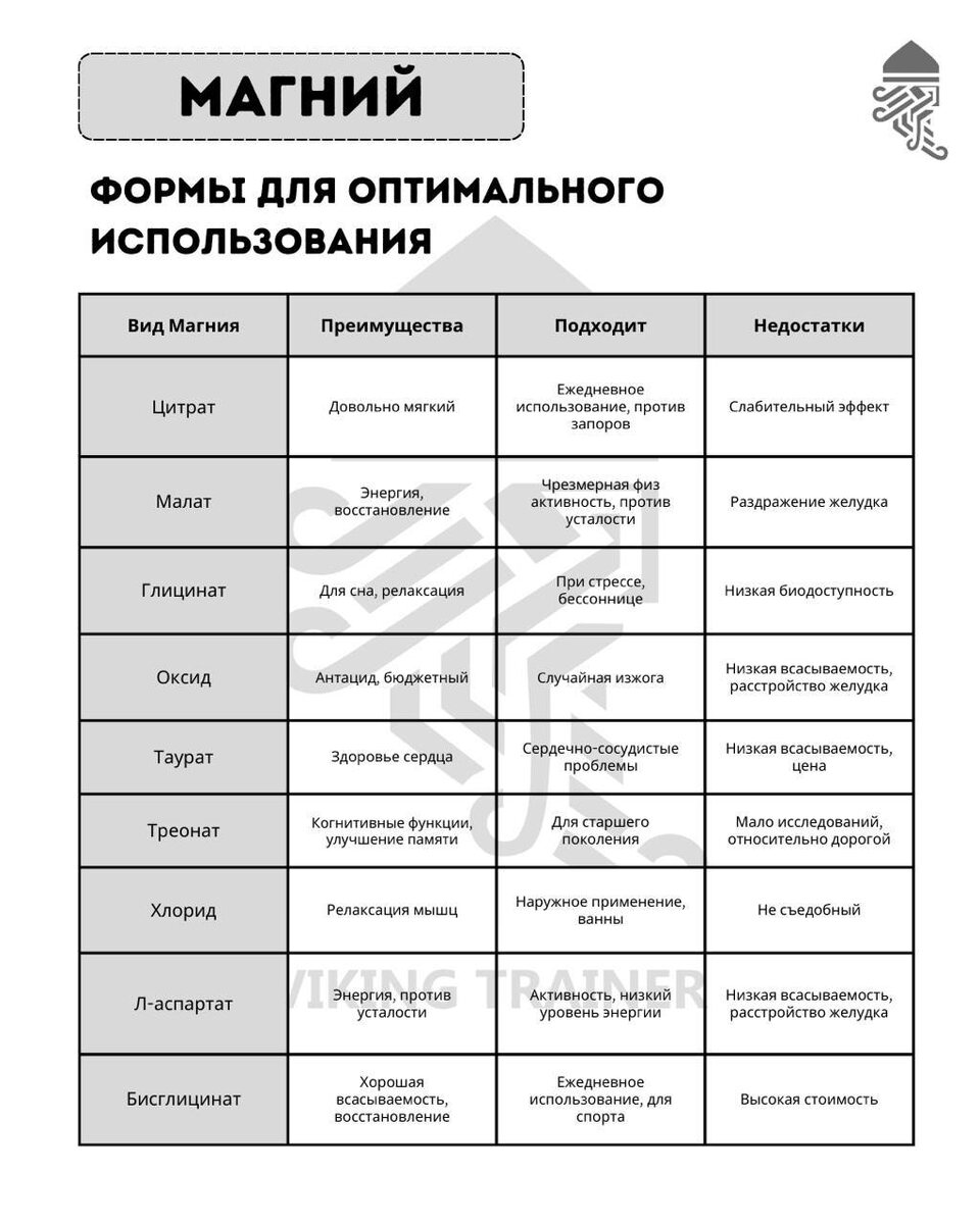 💦 Участвует в передаче нервного импульса, влияет на Углеводный и Фосфорный обмен, поэтому необходим для выработки энергии. Дефицит магния может вызывать: - Нарушение сердечного ритма - Мышечные спазмы - Боли в мышцах после тренировок - Запоры - Повышение артериального давления - Повышение тревожности - Хроническая усталость - Бессонница - Повышение чувствительности к яркому свету и звукам Средняя суточная дозировка Магния - 400мг В таблице расписаны формы Магния, их отличия и задачи которые они выполняют. КаналВикинга — ПОДПИСАТЬСЯ #ЗдоровоеДолголетие@channel_viking