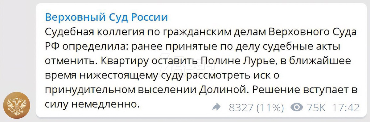 ⚡️«Схеме Долиной» конец Верховный суд РФ постановил признать право собственности на квартиру певицы в московских Хамовниках за Полиной Лурье. Долина продала жилье летом 2024 года за 112 миллионов рублей, а потом заявила, что действовала под влиянием телефонных мошенников, и потребовала признать сделку недействительной. В ближайшее время нижестоящий суд рассмотрит иск о принудительном выселении артистки. 👍Журнал о деньгах Севастополя — подпишись 🔴Подписаться на Севастополь в курсе