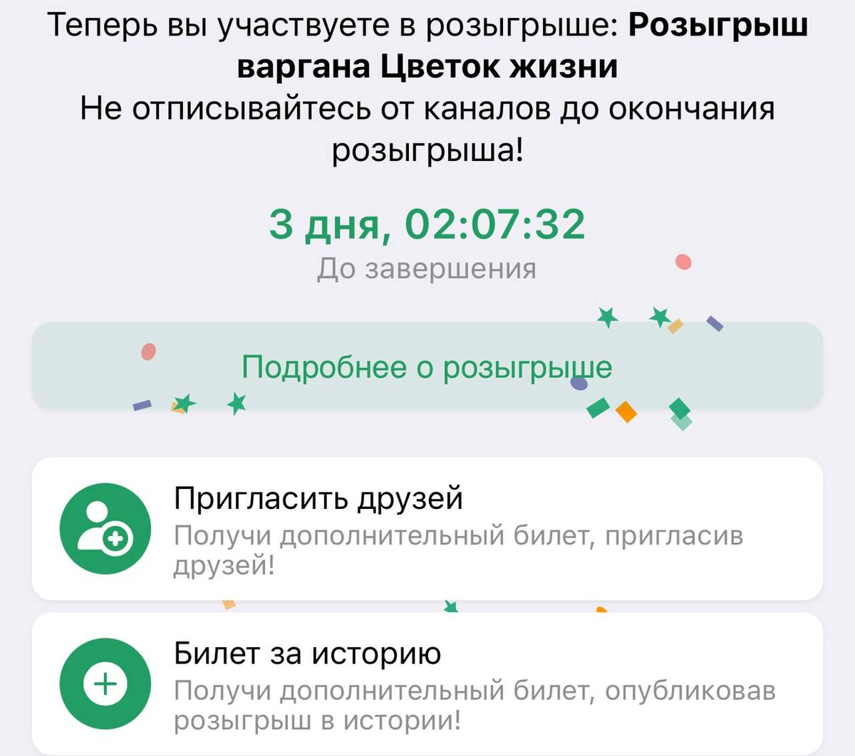 Для увеличение шанса выигрыша в розыгрыше есть функции приглашения друзей и публикация в истории.