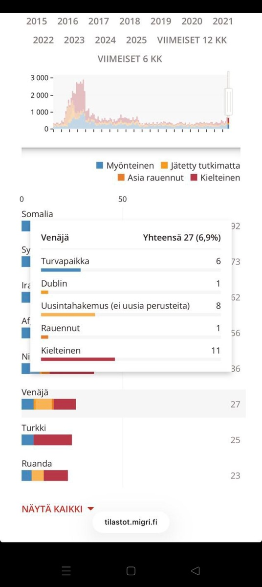 Добрый день, дорогие подписчики и читатели канала. На днях Миграционная служба Финляндии опубликовала данные, согласно которым в ноябре 2025 г. 6 граждан России получили убежище в Финляндии, 11 соискателям было отказано, также 8 человек получили отказы после повторного заявления... Вот скриншот Мигри: