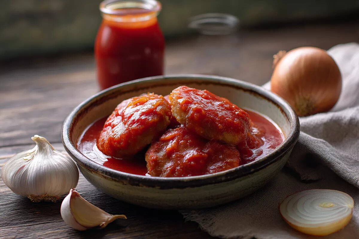 Готовим луковые котлеты на манке с чесноком и яйцом, а потом недолго тушим в томатном соке — получается много и сочно. Очень мелко режем лук и добавляем чеснок Берём 0,5 кг лука и режем его очень мелко. Для этого блюда не подходит измельчитель, мясорубка или блендер — нужна именно мелкая нарезка. Чеснок (2 зубчика) натираем на мелкой тёрке или пропускаем через чеснокодавку. Смешиваем с манкой и даём ей набухнуть К луку добавляем 100 г манки, соль и перец по вкусу, затем вбиваем 2 яйца. Хорошо перемешиваем и оставляем на 10 минут, чтобы манка набухла. Обжариваем котлетки до корочки Разогреваем сковороду с растительным маслом. Формируем котлетки примерно по 1 столовой ложке массы и выкладываем на сковороду. Обжариваем до румяной корочки с двух сторон: через 2–3 минуты переворачиваем, затем уменьшаем огонь и доводим ещё около 5 минут. Готовим томатный сок и тушим котлеты Томатный сок (400 мл) слегка протушиваем отдельно 3–4 минуты. Перекладываем котлетки в сковороду, заливаем томатным сок