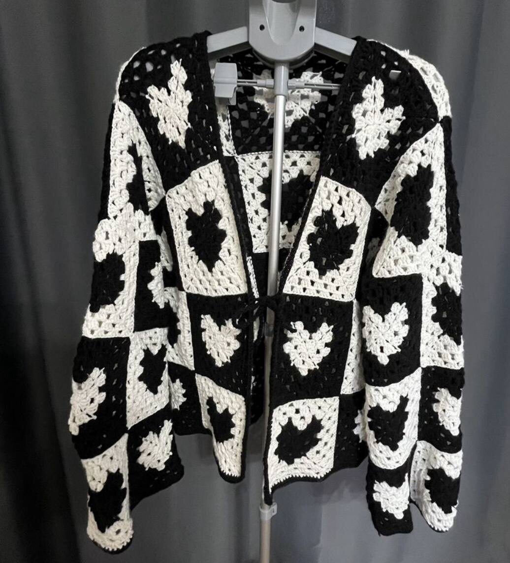 Лето принесло с собой ритмичную геометрию «Бабушкиного квадрата» и язык сердец, вывязанных контрастом черного и белого. Кардиган получился таким, в котором можно укрыться от прохладного вечера, завернуться в него с головой и чувствовать себя в безопасности.