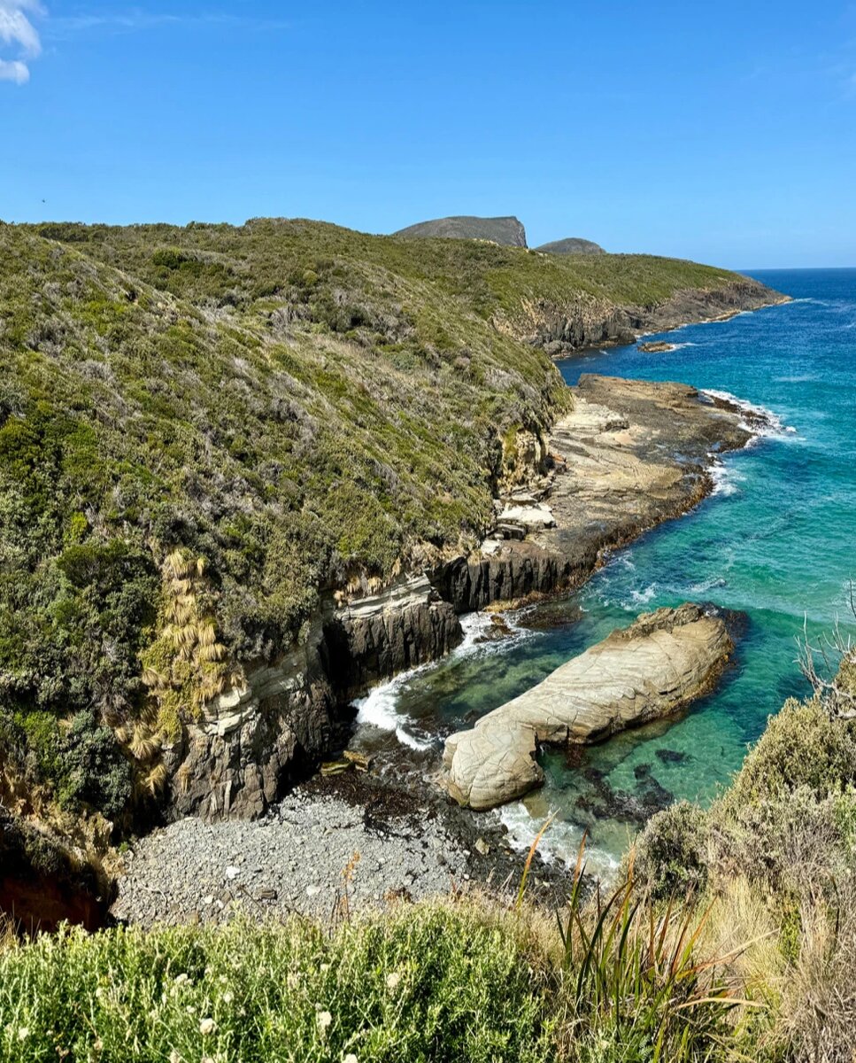Прохлада здесь чувствуется сразу, ещё до того, как взгляд цепляется за пейзаж. Воздух плотный, чуть солёный, и в нём нет привычной для Австралии сухости. Я делаю шаг в сторону от машины, и плечи будто сами опускаются. Дорога тянется вдоль берега, не спеша, без резких поворотов, как будто ей тоже некуда торопиться. Зелёные холмы подступают почти вплотную, и океан появляется внезапно — не как открыточный вид, а как часть фона, к которому здесь привыкли. Тасмания выглядит собранной и сдержанной. Холмы не кажутся дикими — они аккуратные, мягкие, с короткой травой и редкими деревьями, которые стоят порознь, не образуя плотной стены. Ветер проходит между ними свободно, не ломая, а лишь слегка меняя направление травы. Иногда кажется, что всё пространство здесь настроено на один ритм: не медленный и не быстрый, просто устойчивый. В таком месте внимание перестаёт цепляться за детали, и взгляд начинает скользить шире. Дорога идёт почти у самой воды. Океан не шумный, без резких волн, но его