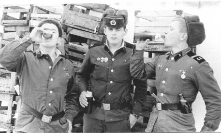 После отбоя дембеля в каптерке иногда выпивали. Повар в столовой и хлеборез снабжали своих друганов первостатейной закусью- не служба а прямо малина- калина для некоторых.