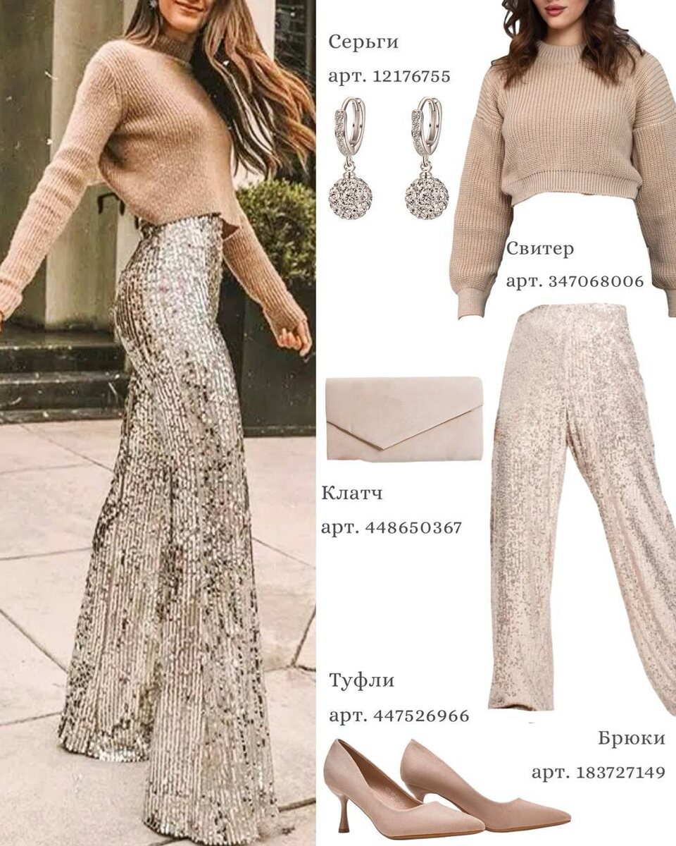 Образ строится на контрасте: акцентные брюки с пайетками и спокойный, нейтральный верх. Такой приём делает образ праздничным, но не перегруженным. Брюки визуально вытягивают силуэт, а простой верх уравновешивает блеск, создавая ощущение стиля «без усилий».