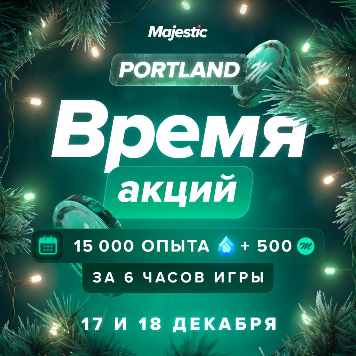 🤩 Запускаем акцию на ВСЕХ серверах 17 и 18 декабря — 15 000 exp Зимнего пропуска и 500 MC за 6 часов игры, а также играйте с двойной выгодой после рестарта в 6 утра: • Х2 зарплаты во фракциях; • Х2 доход на работах; • Х2 ресурсы на лесорубе; • Х2 руды на карьере; • Х2 ресурсы на грибнике; • Х2 шанс на повышенный вес рыбы на рыбалке; • Х2 урожай на ферме (кроме «сорванных кустов», «семян Green»). ❤️ — X2 желание играть! ❤️ Majestic Role Play