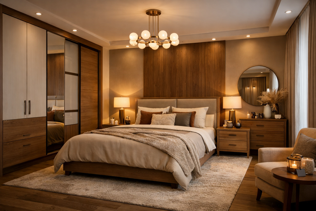 Чтобы спальня была не только красивой, но и удобной, стоит продумать планировку. Между кроватью и шкафом должно быть достаточно места для комфортного прохода (не менее 60 см). Тумбочки располагают так, чтобы можно было свободно открывать ящики. Зеркало лучше повесить на стене напротив окна – это добавит света.
