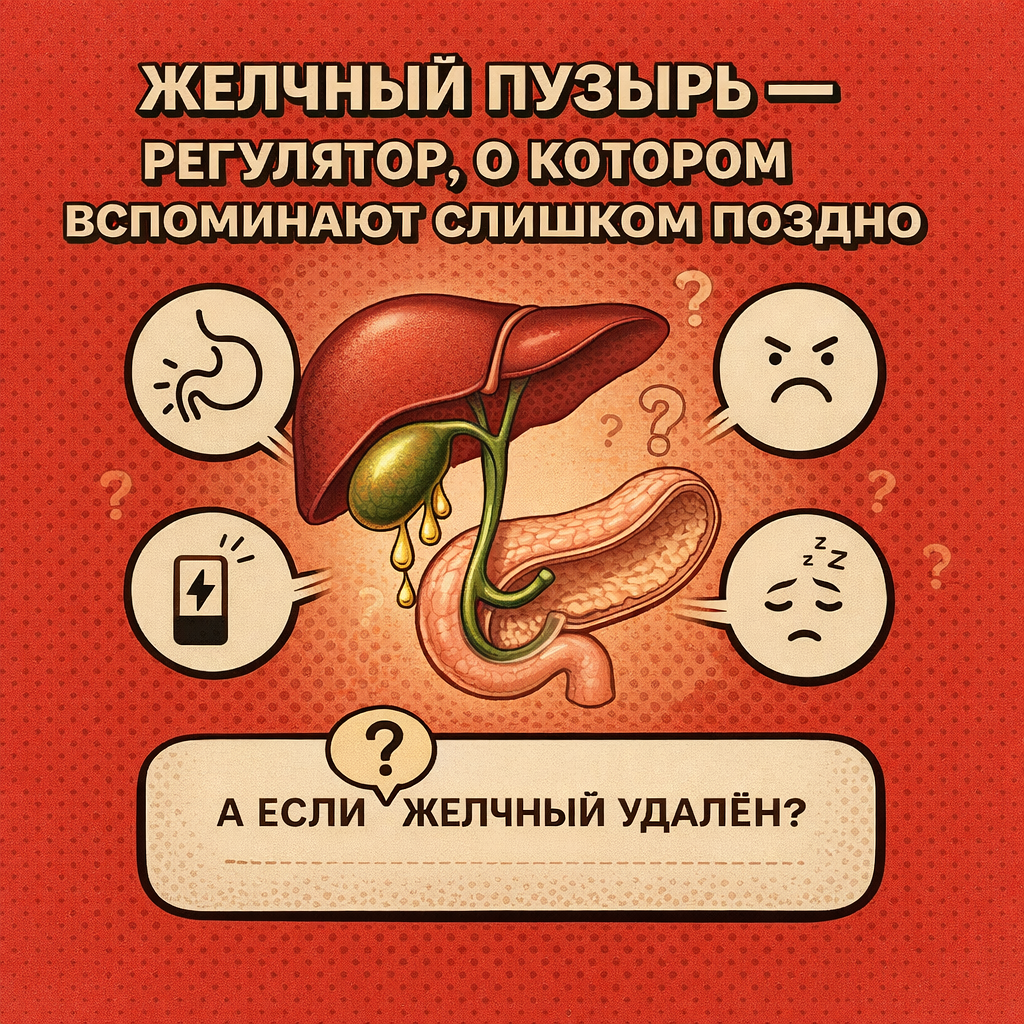О желчном пузыре редко думают заранее. Чаще — когда уже есть тяжесть, вздутие, сонливость после еды или когда появляется ощущение, что пищеварение «работает как-то не так». Важно понимать: желчный пузырь — это не хранилище. Это регулятор ритма пищеварения. Он задаёт: ✅ когда желчь должна выйти ✅ в каком объёме ✅ под какой приём пищи Если этот ритм нарушен, организм реагирует не болью, а изменением состояния: ❌ тяжесть и ощущение переполненности ❌ сонливость после еды ❌ снижение энергии — раздражительность — ощущение, что еда «не даёт сил» При этом анализы могут быть в норме, а человек годами ищет причину в «не той еде» или «желудке». На самом деле тело сигналит о сбое регуляции, а не о проблеме одного продукта или органа. ❓ Вопрос, который вы задаёте чаще всего «А если у меня желчный пузырь удалён?» Очень важный и правильный вопрос. Удаление желчного пузыря не означает, что желчь исчезла. Печень продолжает вырабатывать её постоянно — иначе невозможно нормальное пищеварение и обмен вещ