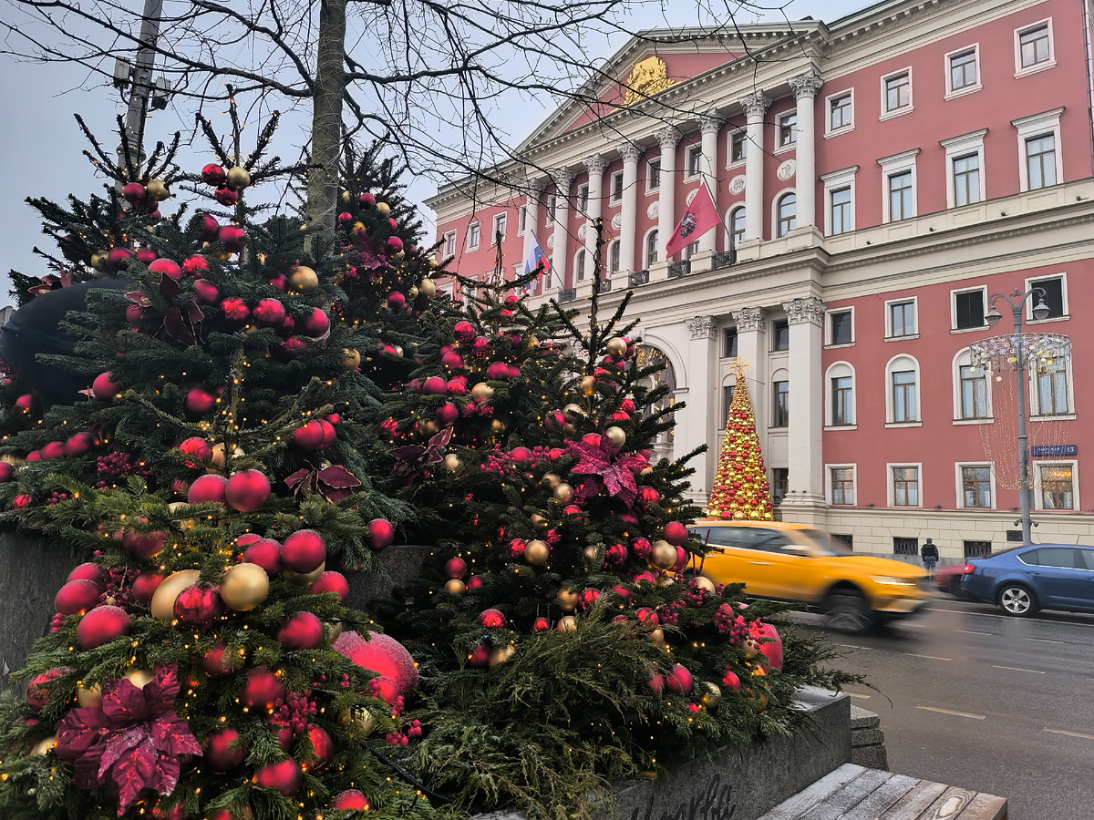 Сегодня предлагаю прогуляться по одной из основных площадок фестиваля "Путешествие в Рождество" на Тверской площади аккурат возле памятника основателю Москвы Юрию Долгорукому и напротив Мэрии Москвы. Очень нравится этот глубокий аристократический зелёный. Большая нарядная ёлка установлена прямо на Тверской улице. А вход украшают два огромных шара. Здание Мэрии Москвы как всегда впечатляет. Один из двух шаров у входа рассмотрим поближе. Второй шар с надписью "Москва". Композиция на входе из шариков и ёлочек. Ёлочки на Тверской площади украшены валенками-коньками в натуральную величину (детского размера), расшитые пайетками,тесьмой и искусственным мехом. Белые. И красные. Среди украшений на ёлочках нашла вот такого благородного оленя. К украшению торговых рядов добавлены красные портьеры с гирляндами золотых огоньков. Игрушечные лошадки в этом году суперпопулярны в новогодней тематике. Обратила внимание на очень красивые новогодние композиции. Они прекрасны и нереально дороги. Полюбуемся