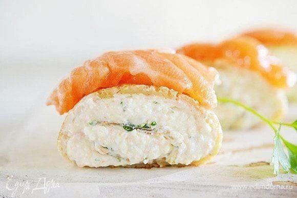 2. Сёмгу нарежьте тонкими слайсами (широкими лентами) и выложите на каждый рулетик веером.