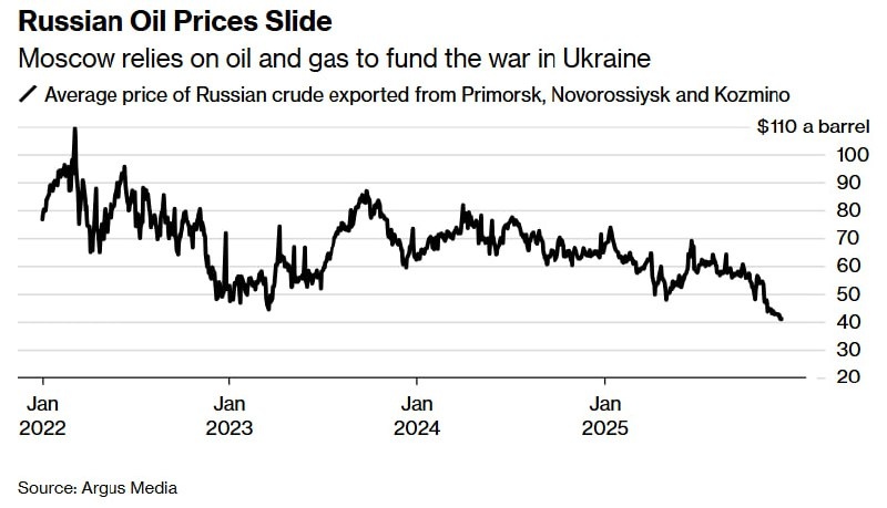 😱 Российская нефть опустилась до минимальных с начала СВО отметок — 40 долларов за баррель, пишет Bloomberg