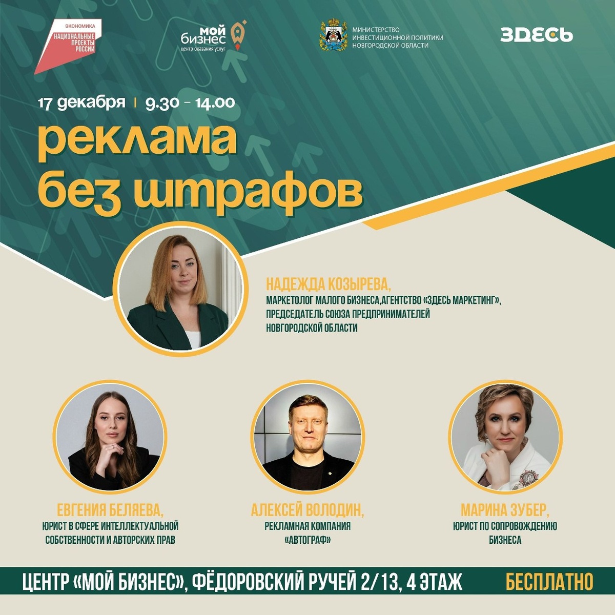 » ✍Семинар «Реклама без штрафов» состоится в центре «Мой бизнес» Мероприятие пройдет 17 декабря, с 9.30 до 14.00. В программе: ✔9.30-11.00 Надежда Козырева «Закон о рекламе, маркировка» ✔11.00-11.40 Евгения Беляева «Закон о русском языке в рекламе» ✔11.40-12.20 Алексей Володин «Новые правила по вывескам» ✔12.20-13.00 Марина Зубер «Персональные данные в рекламе» ✔13.00-13.45 Надежда Козырева «Закон о блогерах, общие нарушения закона о рекламе». Для участия необходимо написать слово «закон» в сообщения по ссылке: vk.me/zdesmarketing. Семинар организован центром «Мой бизнес» при содействии мининвеста по нацпроекту «Эффективная и конкурентная экономика». #мининвест53