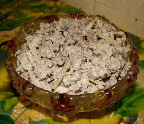 Предлагаю вместе со мной сегодня приготовить этот салат. 1. Легкое говяжье или свиное - 1 кг 2. Лук репчатый - 2 больших головки 3. Кубики грибного бульона - 3 шт 4. Майонез - 200 г 5. Масло растительное - 30 г Шаг 1. Отвариваем лёгкое 3 часа (не солим). Разбираем его от хрящей и нарезаем не крупным кубиком. Шаг 2. Репчатый лук нарезаем кубиком и пассируем его на растительном масле (именно пассируем, а не жарим) до прозрачности. Шаг 3. Добавляем растертые в порошок кубики, перемешиваем и даем соединиться с горячим маслом и луком буквально 1 минуту. Шаг 4. Еще горячее содержимое сковороды выкладываем в легкое. Все хорошо перемешиваем, чтобы кусочки лёгкого пропиталась ароматным маслом с луком. Шаг 5. Даем полностью остыть и заправляем майонезом. Сверху можно украсить свежим, нарезанным укропом. Получился очень сытный, вкусный и необычный салат, который понравится всем! Приятного аппетита!