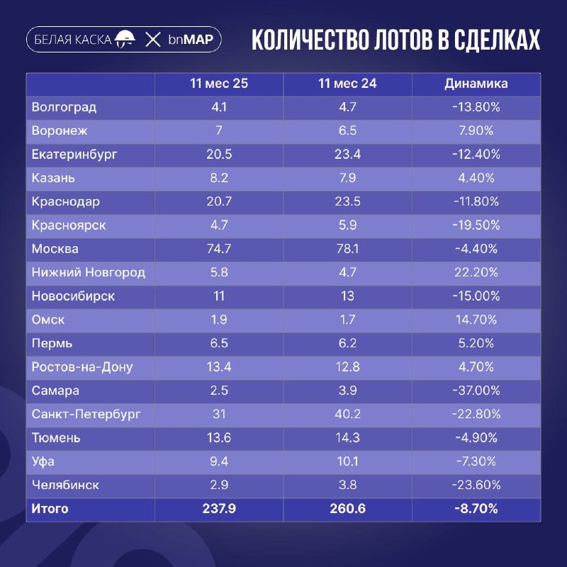 Всего за январь–ноябрь 2025 года в 17 мегаполисах было зафиксировано 237,9 тыс. лотов в сделках, что на 8,7% меньше, чем за аналогичный период прошлого года.