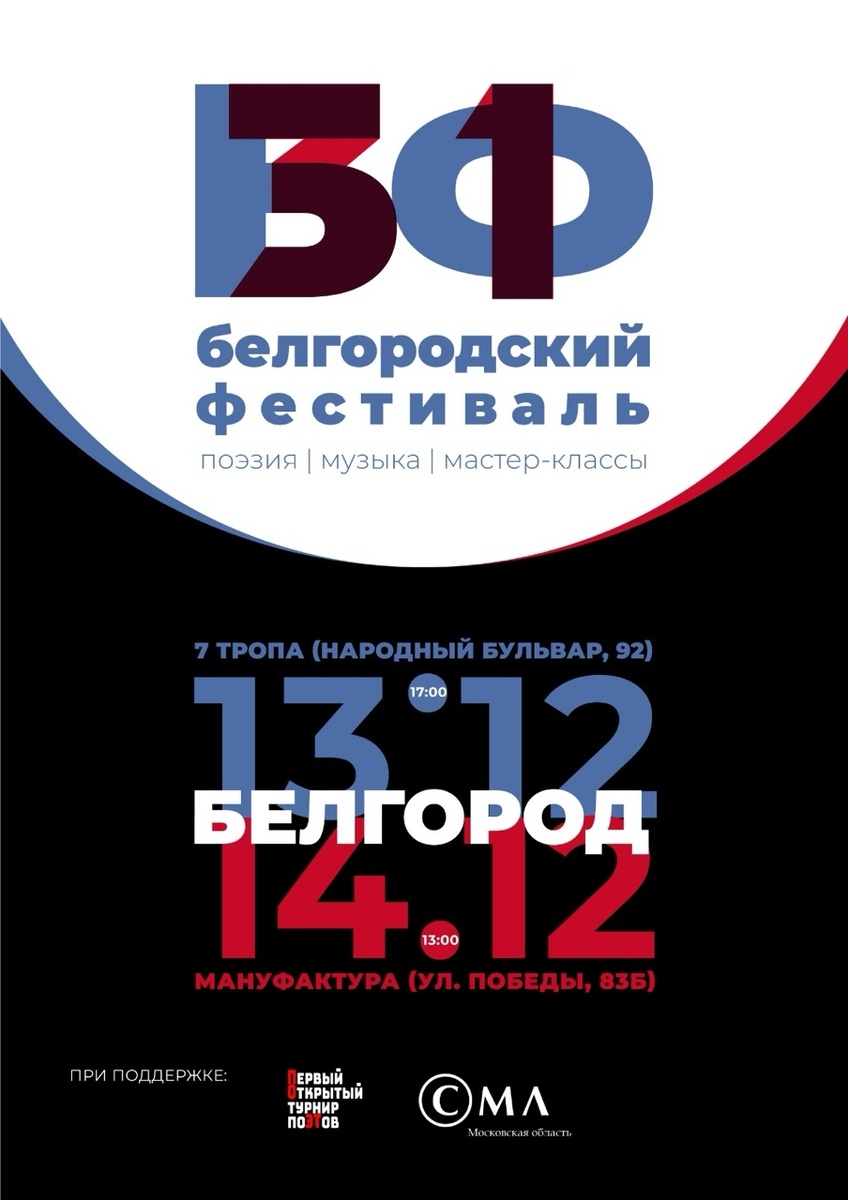 В неформальной, непринуждённой атмосфере прошёл в эти выходные, 13-14 декабря, первый БФ, собравший поэтов и бардов-песенников из Москвы, Воронежа, Орла, Курска, Белгорода, Губкина, Старого Оскола, их поклонников со всей нашей области. Два дня звучали авторские песни и стихи старейших обитателей белгородских подмостков и новичков, и гостей Белого Города. Презентация фестиваля состоялось в АРТ-клубе «Седьмая Тропа» на Народном бульваре, что символично, открыл действо воронежский бард Олег (Ватсон) Автономов, неизвестными мне, но очень симпатичными песнями. С приветственными словами выступили организаторы фестиваля Татьяна Лапинская, Андрей Хамхидько и Виталий Волобуев. Поэтические выступления спонтанно перемежались авторскими музыкальными композициями. На второй день БФ переместился на сцену «Мануфактуры», где прошли мастер-класс по фото-искусству Андрея Закоморного, поэтическая мастерская Татьяны Лапинской, поэтический баттл и концертная программа участников фестиваля. Выразительно в