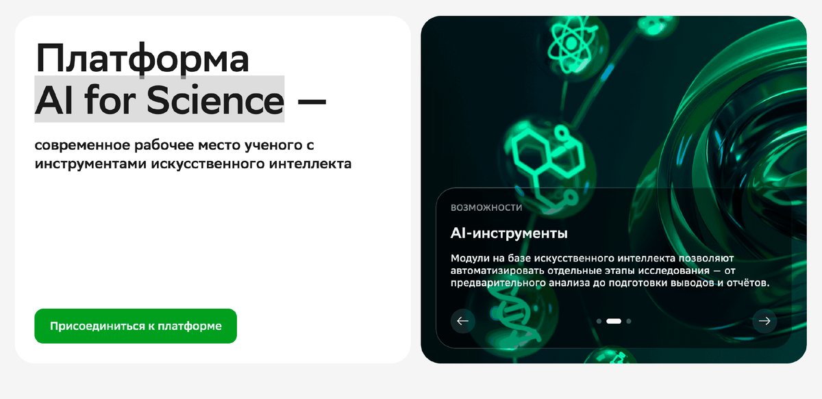 Платформа объединяет три ключевых элемента: Главная сила — в «цифровых коллегах». Это ИИ-агенты, которые берут на себя часть интеллектуальной работы. Вот лишь несколько примеров: Эти инструменты не заменяют учёного, но умножают его возможности, освобождают время для генерации идей, постановки задач и интерпретации результатов. Работать умнее — не значит работать больше. Это значит работать над тем, что действительно имеет значение. Давайте делать науку будущего вместе. Перейти в сервис Платформа создана в рамках инициативы «Решения и сервисы для профессионального сообщества» Десятилетия науки и технологий. ______