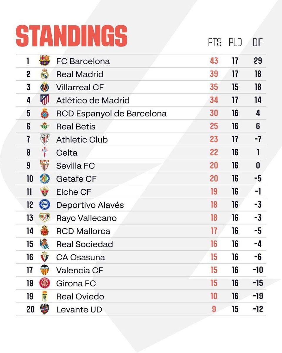 Турнирная таблица Испанской Ла Лиги после 16 тура.