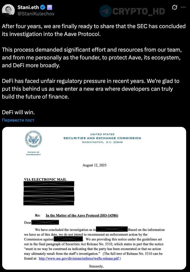 ! SEC прекратила проверку Aave, которую начала в 2021 году. Регулятор изучал, нарушает ли работа протокола и токена AAVE законодательство о ценных бумагах. CEO Aave: «В последние годы DeFi сталкивался с несправедливым давлением со стороны регулирующих органов. Мы рады оставить это позади и вступить в новую эру, где разработчики смогут по-настоящему строить будущее финансов». Crypto Headlines