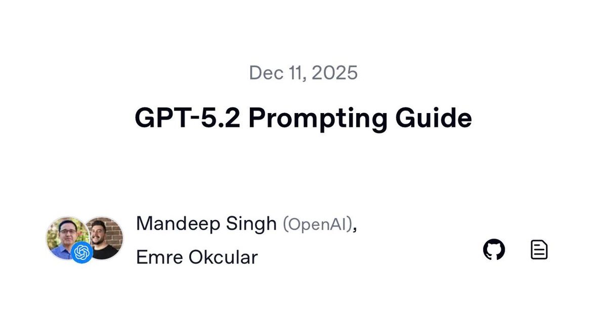 ? OpenAI опубликовали официальный гайд по промптам для GPT-5.2. Документ описывает, как управлять поведением модели. По сути спецификация для работы с ИИ как с системой, а не как с чат-ботом. Результаты модели это подтверждают. 1️⃣53-54% в ARC-AGI-2 при среднем уровне около 60%. 2⃣Экзамен AIME 2025 пройден без ошибок - уровень продвинутой математики. 3️⃣В GDPval модель держит 70-74%, что соответствует сильному прикладному специалисту. На практике это означает, что модель начинает уверенно работать в задачах, где важны рассуждение, перенос логики и проверка гипотез, а не просто извлечение информации. —————————————- 🛷 Вам подарок Скоро Новый год, и мы решили с культовыми каналами собраться в новой папке «IT 2.0», чтобы дать максимум пользы. Внутри - каналы, где первыми выходят новости и апдейты, реальные инструменты, разборы, промпты и тот самый лютый фарш, который экономит месяцы времени. Сохраните себе ➡️ https://t.me/addlist/ZiLb9h7vZLE1Nzky Повтора этой папки не будет. Успейте