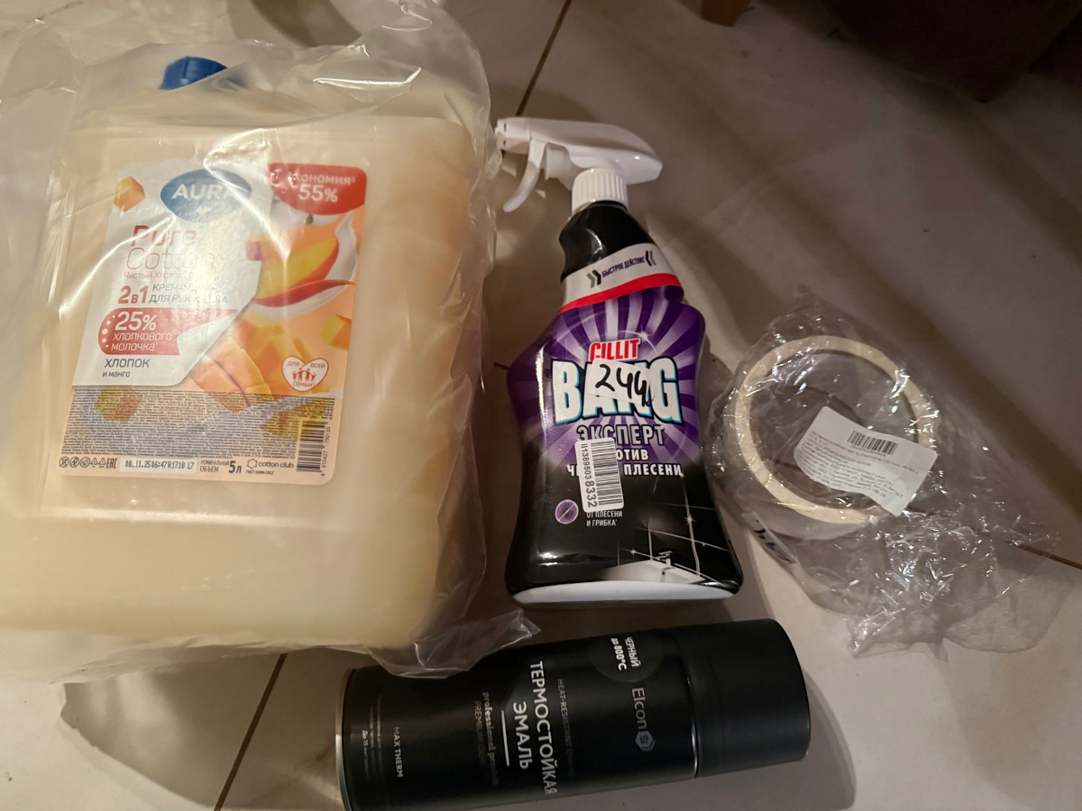 После череды уборок я поиздержалась - мои запасы чистящих средств стали заканчиваться. Поэтому я решила их немного пополнить Я люблю большие объёмы, поэтому взяла сразу 5 л жидкого мыла заполнить диффузоры на раковинах в санузлах и на кухне, что и сделала в минувшее воскресенье. Для тела я обычно использую другие средства. По отзывам выбрала средство от черной плесени - хочу пройтись по швам за раковиной и по резинке стиральной машины: в санузле нет полотенцесушителя, поэтому там достаточно прохладно. Есть очаги плесени на силиконе, которые появились в конце осени Средство рабочее, я его сразу опробовала. Вот что получилось: Практически все очаги исчезли, осталось пару глубоких, но я их тоже выведу) Наносила, выдерживала и оттирала несколько раз. Этим же средством почистила плиточные швы - вся серость исчезла мгновенно, но для лучшего результата повторю еще раз.. Потом опробовала его на уплотнителе люка стиральной машины - тоже хорошо работает! Могу его рекомендовать! Еще на фото ес